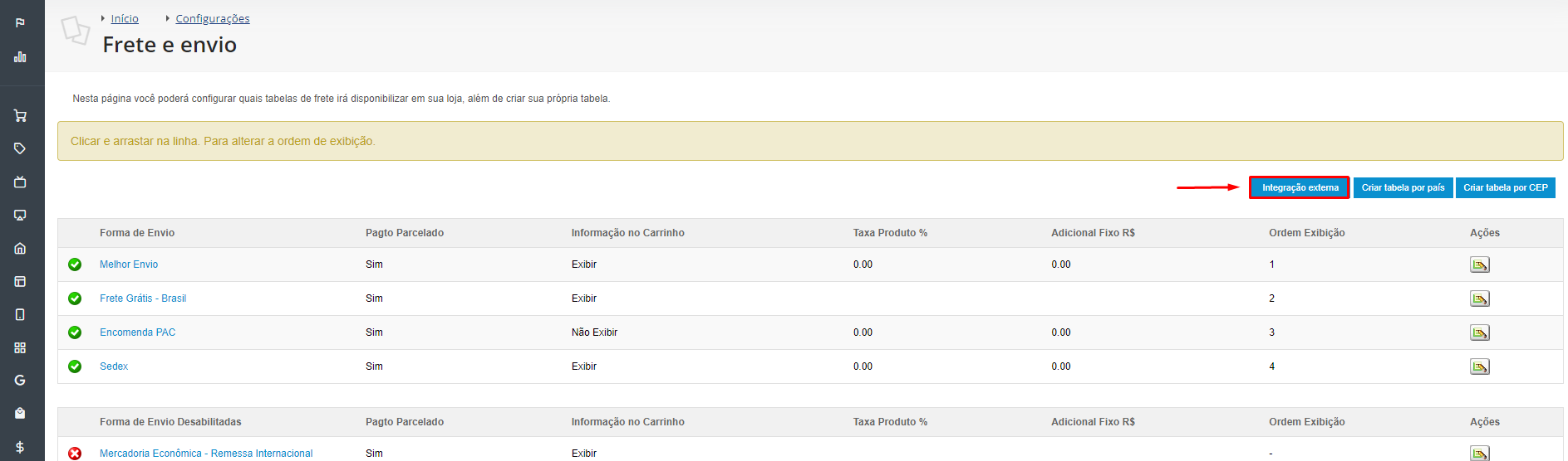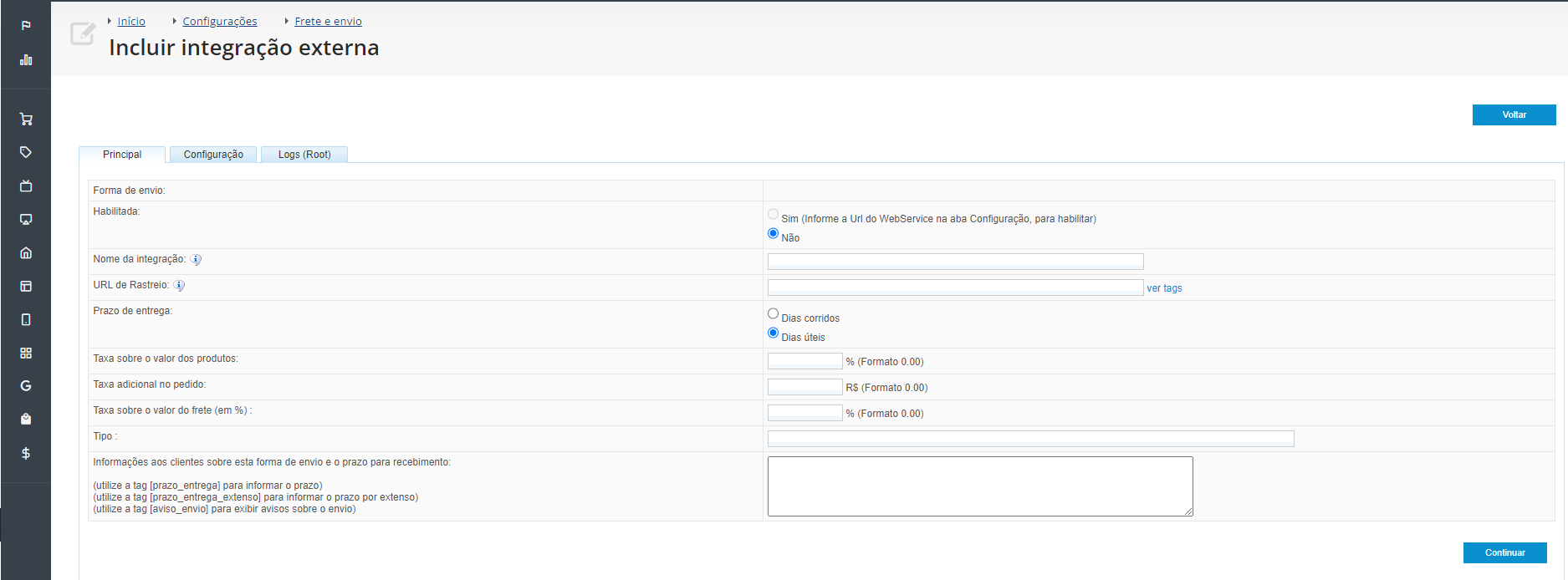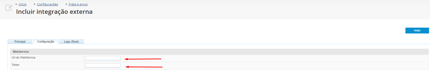 - Agora na próxima tela preencha com a URL de Frete e Token, também citados acima.