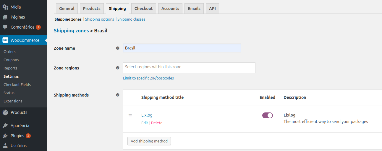 - Acesse WooCommerce > Settings > Shipping e clicar em Add shipping Zone