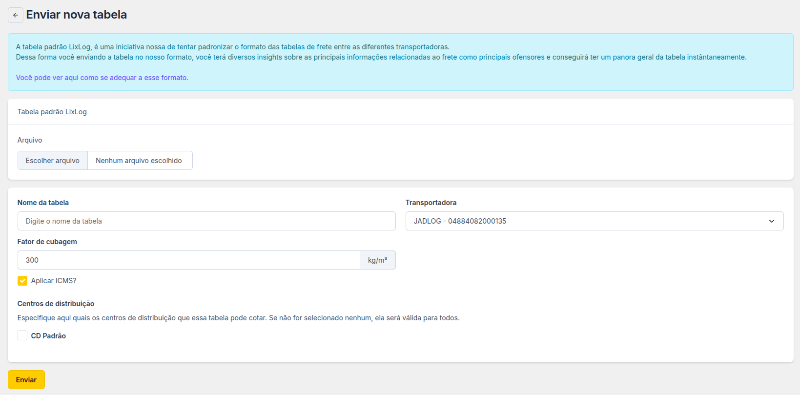 Com a tabela de frete no padrão LixLog em mãos é só ir em: Transportadoras > Tabelas de frete > Enviar nova tabela