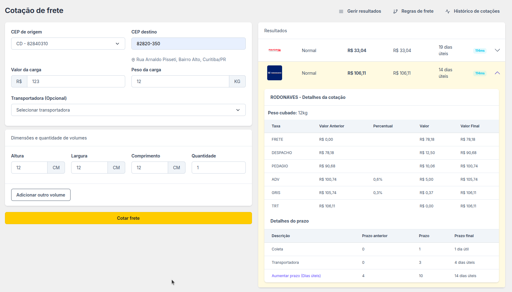 Para testar é só ir em Cotações e fazer uma cotação de teste, clicando no nosso detalhamento voce pode ver como cada taxa é foi calculada, já incluindo o ICMS, conforme o nosso exemplo.